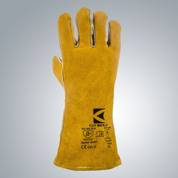 Wzmocnione rękawice spawalnicze Top Merlin są wykonane są z najwyższej jakość dwoinowej skóry bydlęcej dzięki czemu są trwałe, odporne na zużycie oraz zapewniają doskonałą ochronę przed działaniem wysokich temperatur.